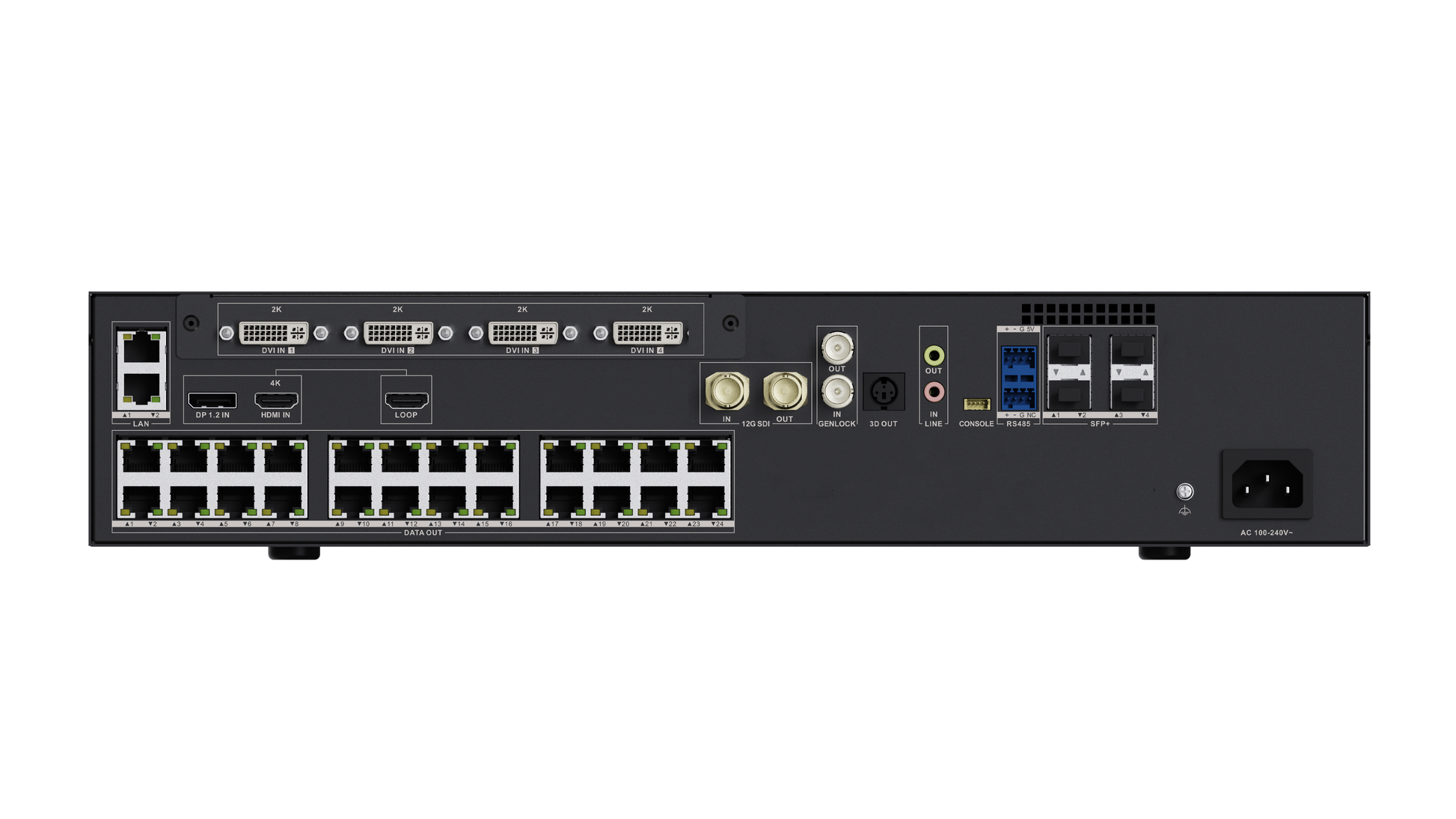 - Support 7 video inputs including 1 × DP1.2, 1 × HDMI2.0, 1 × 12G-SDI, and 4 × DVI interfaces.